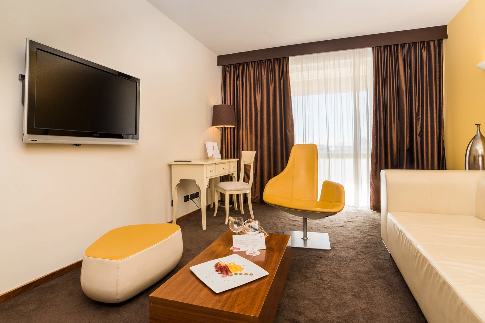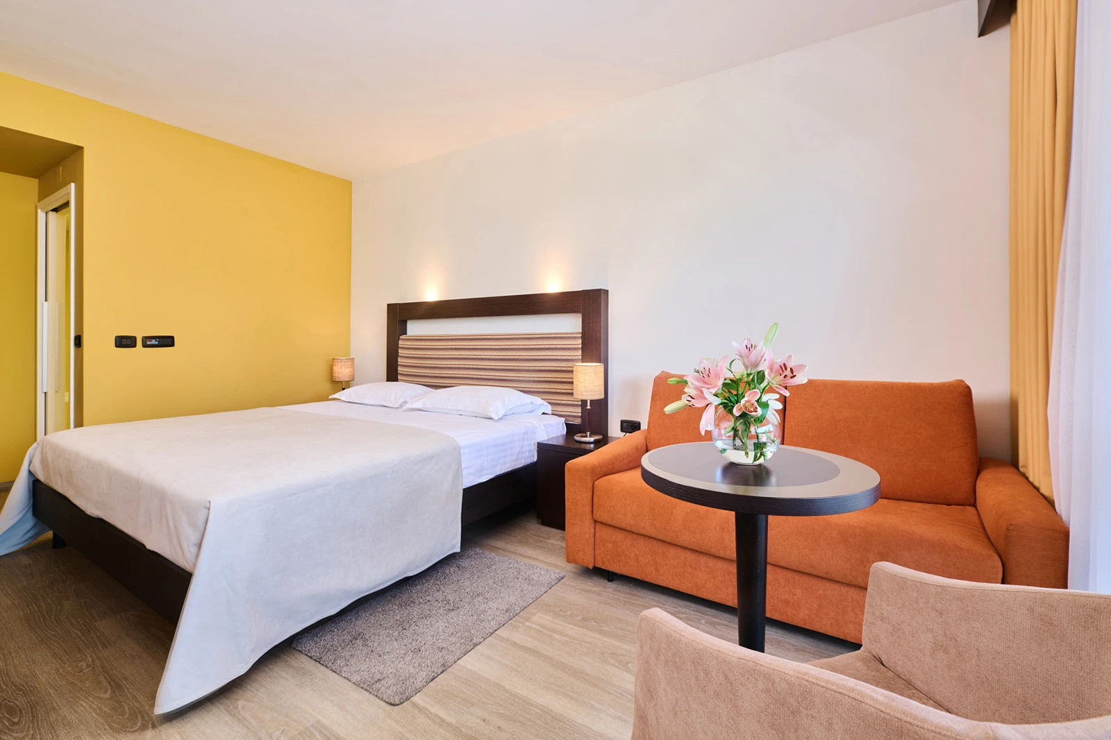 Moderno uređene sobe i apartmani imaju balkon, klimu, mini-bar, TV, sef i besplatan Wi-Fi. Apartmani nude dodatni dnevni boravak, a sve smeštajne jedinice imaju privatno kupatilo s fenom i toaletnim priborom. Usluga je na bazi polupansiona, uz bogat izbor lokalnih i internacionalnih jela, uključujući vegetarijanske i bezglutenske opcije.