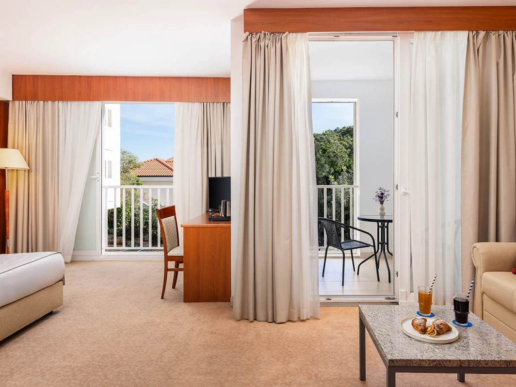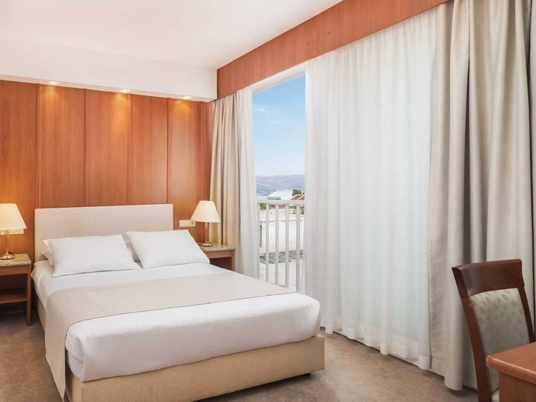 Elegantno uređene sobe nude sve za udoban boravak – klima-uređaj, flat-screen TV, mini-bar, sef, besplatan Wi-Fi i moderno kupatilo sa fenom. U ponudi su standardne, superior i porodične sobe, kao i junior apartmani s pogledom na more i balkonom. Usluga se zasniva na noćenju sa doručkom, uz mogućnost doplate za polupansion. Plaža je udaljena oko 100 metara od hotela, delom šljunkovita, delom betonska, a ležaljke i suncobrani dostupni su uz doplatu.
